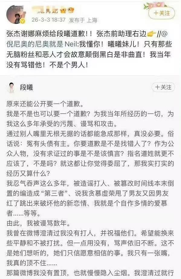 这次李雨桐的发文,紧接着谢娜发文,让薛之谦和张杰的恩怨再次被放在台面上。再然后张杰前女友段曦控诉:指张杰恋爱期间出轨,分手后自己遭多年网暴(如“掌掴谢娜”谣言),代言被撤,斥张杰未替其澄清。她力挺薛之谦“重情重义”,质疑谢娜双标。